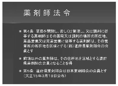 幾つか最初に申し上げておきたいことがあります。「薬剤師法令」というのが出てまいります。大正15年の3月18日に発布されました。この薬剤師法令で日本薬剤師会は公法人になるのですが、これは強制加入であります。この時期、薬剤師たるものは日本薬剤師会に全員入会、という強制加入となったのはこの薬剤師法令に基づいてのことです。