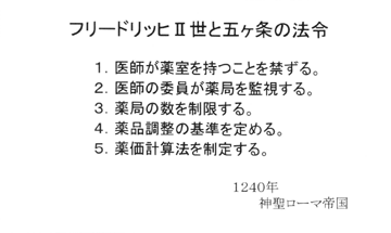 そして、この制度を自分のことだけではなくて、国の制度にしようと考えたんですね。それが1240年に神聖ローマ帝国で、フリードリッヒ二世が出した五カ条の法令という法令です。これが医薬分業といわれる薬剤師が表に出てきた初めての法律ですね。つまり、医師が薬室を持つことを禁じる。お医者さんが薬室を持つことを禁じるというのは、院内調剤ができない。やったら国で罰則を与えるという法律をつくったわけです。これが1240年です。しかし、薬剤師のほうも何をやるか分からない。西洋では人間不信、つまり医者も悪いことをするけれども、薬剤師もやるだろう、偽薬みたいなものを持ってきて、それを「処方せんのこの薬です」というふうに渡しかねない。だから、お医者さんの医院が時々薬局を巡回することにしよう、偽薬なんて置いていないだろうなと。そして、薬局の数を一定の地区に制限しましたが、それは監視しやすいからというわけです。