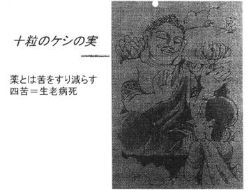 同じように、やはり仏教説話のひとつですけども、「10粒のケシの実」という有名な話があります(スライド)。それは、当時のインドで非常に貧しい村の生まれの若いお母さんが子供を産んだけれども、その子が生まれてすぐに亡くなってしまった。ひ弱だったんですね。そのお母さんは死んだ子供を抱きしめて、お釈迦様のところにやってきて言います、「あなたは何でもできると聞いているから、この子を生き返らせてくれ。できるじゃないか」と。お釈迦様には神通力というのがあって、何でもできると聞いているから、生き返らせてくれと言うんですね。そこでお釈迦様は何と言ったと思いますか。「できる。やりましょう」と。不可能なことを言ったんですね。なぜ言ったか。これもここから問題になるのですが、「できる、やりましょう。しかし・・・」と、条件をつけるんですね。「10粒のケシの実を村で貰っていらっしゃい」。ケシというのはモルヒネの原料ですね。鎮痛剤になっていて、いまはがんの時によく使うでしょう。当時のインドでは、ケシの実というのは村の農家がみんな持っていて、痛み止めに使ったり、いろいろなことをやっていたんでしょうね。だから持っている。
